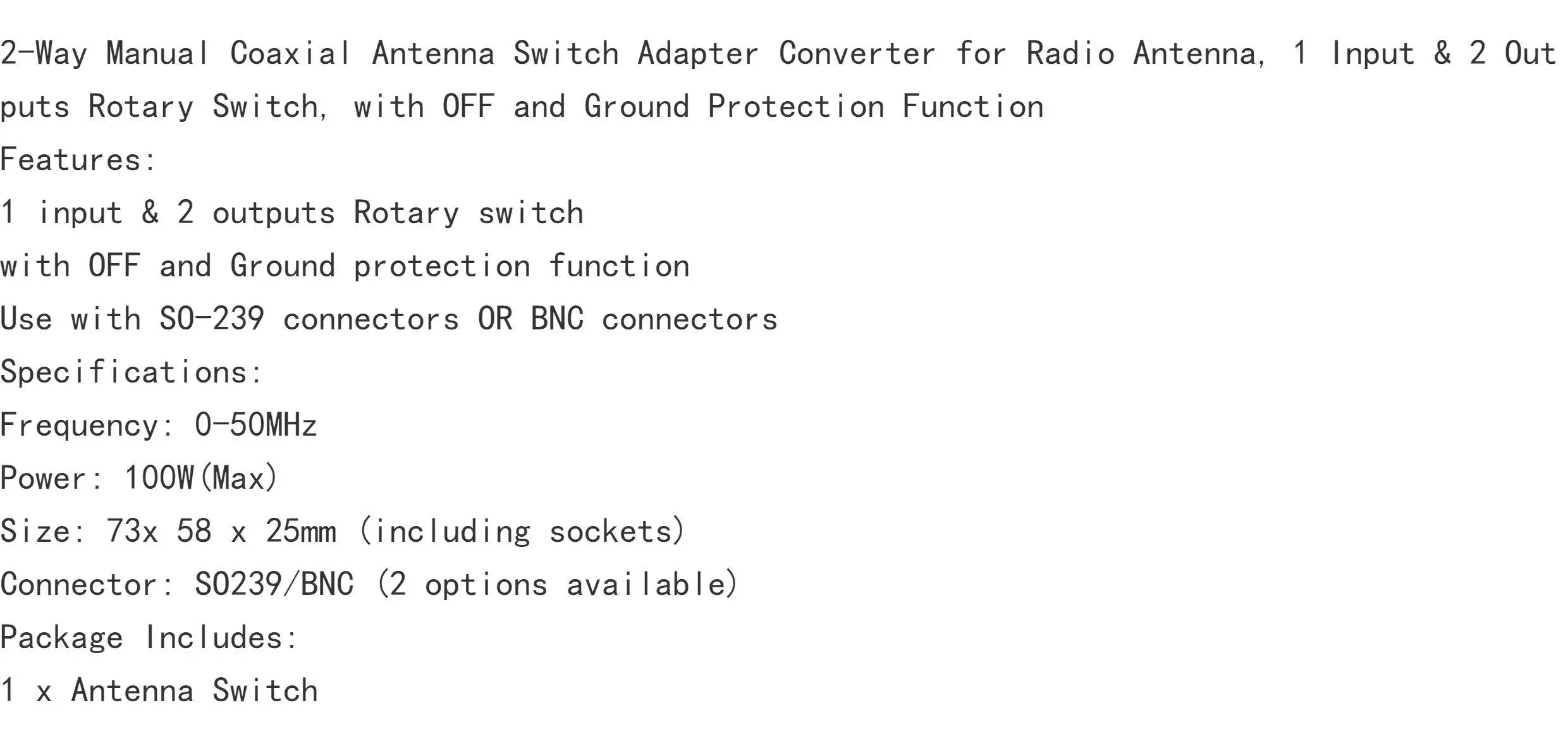 Be the first to review “2-Way Antenna Switch | 100W High Power HF Coax Selector (0-50MHz)”
